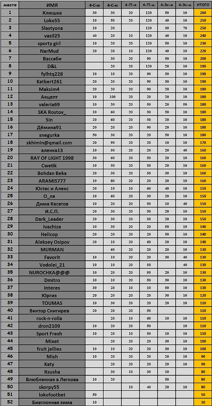 Этот этап выиграла Клюшка, призеры loko55, Slastyona - Поздравляю!!! Примечательно что все 6-ро лидеров набрали максимум за счет правильной расстановки в персьюте тройки лидеров и за это получили бонусы. А lokofootbet угадал Виткову в спринте.