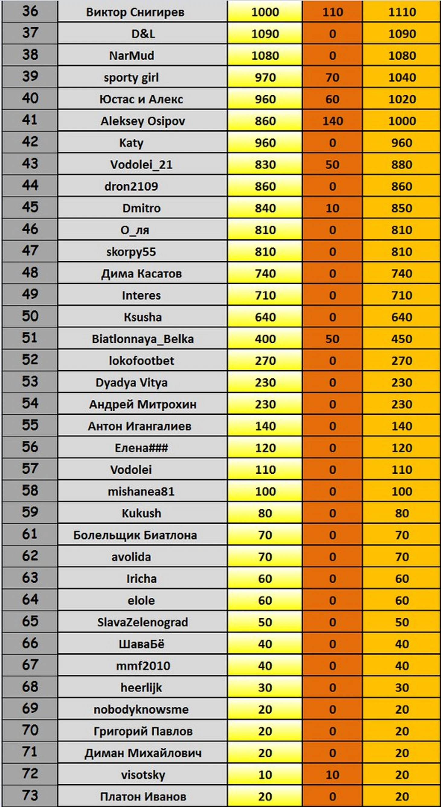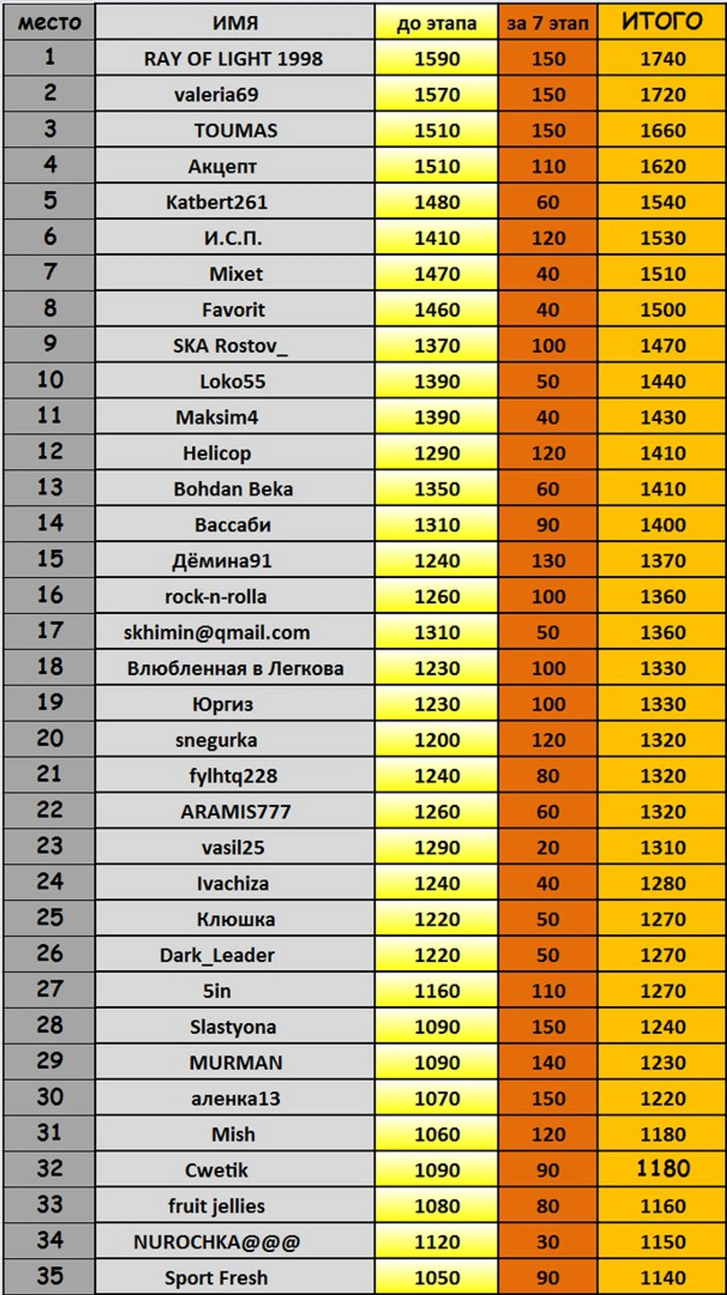 Теперь к таблице за этап, здесь у нас паритет и сразу 5 подписчиков и наши 3 лидера набрали по одинаковому количеству очков. Значит все разборки будут впереди.