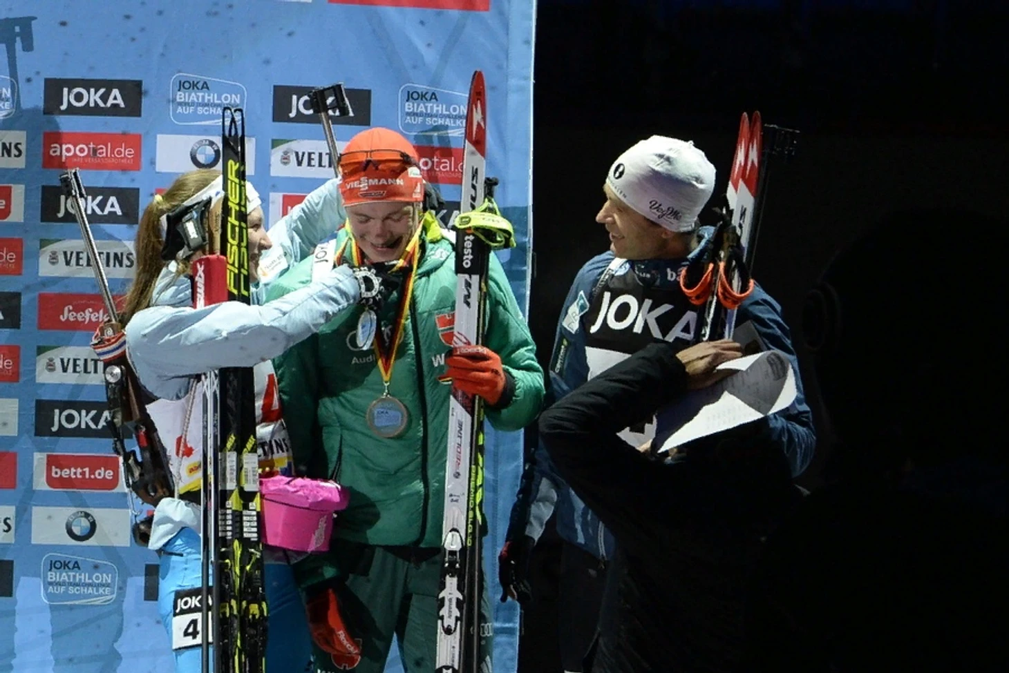 Уле и Даша в долгу не остались. Они позвали Бенедикта на подиум и отдали ему бронзовые медали.
