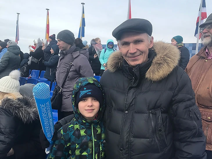 Сергей и внук Тимофей в шапке «Зенита» приехали на лыжные гонки в кластер «Радуга», стояли на центральной трибуне, смотрели то на лыжников, то на бабулю с трещоткой, то куда-то в горы. Конечно, я подошел к ним из-за «Зенита», узнал, что Тимофей обожает Дзюбу и Роберта Мака (не самый очевидный выбор) и до похода на Универсиаду никогда не видел большой спорт так близко. Максимум – матчи «Зенита» по телевизору.