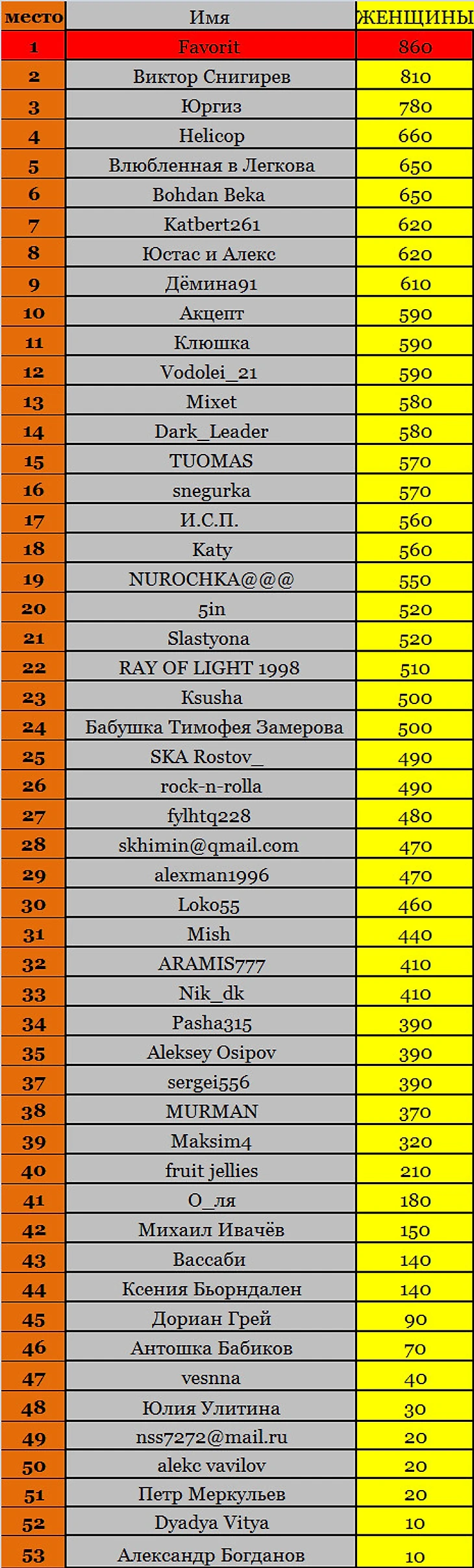 3.  Зачет женского кубка мира побеждает Favorit, оправдывая свой ник-нейм.