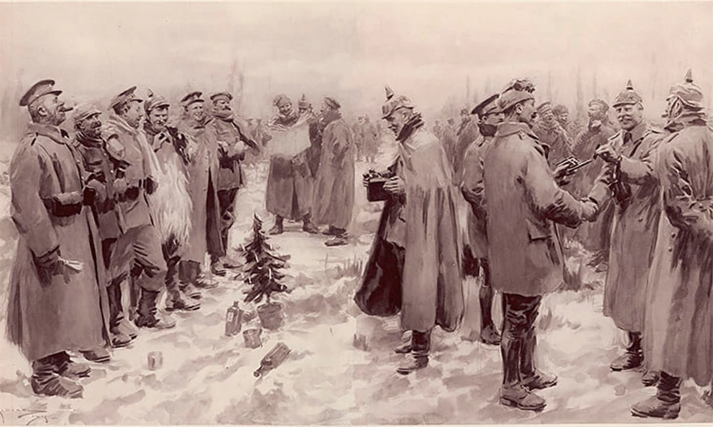 Впервые массовое братание на линии Западного фронта произошло в сочельник, 24 декабря 1914 года. Немцы украшали окопы подарками, присланными из ставки, и пели песни. Британские солдаты, увидев горящие гирлянды на брустверах врагов, подхватили знаменитый рождественский гимн Silent Night.