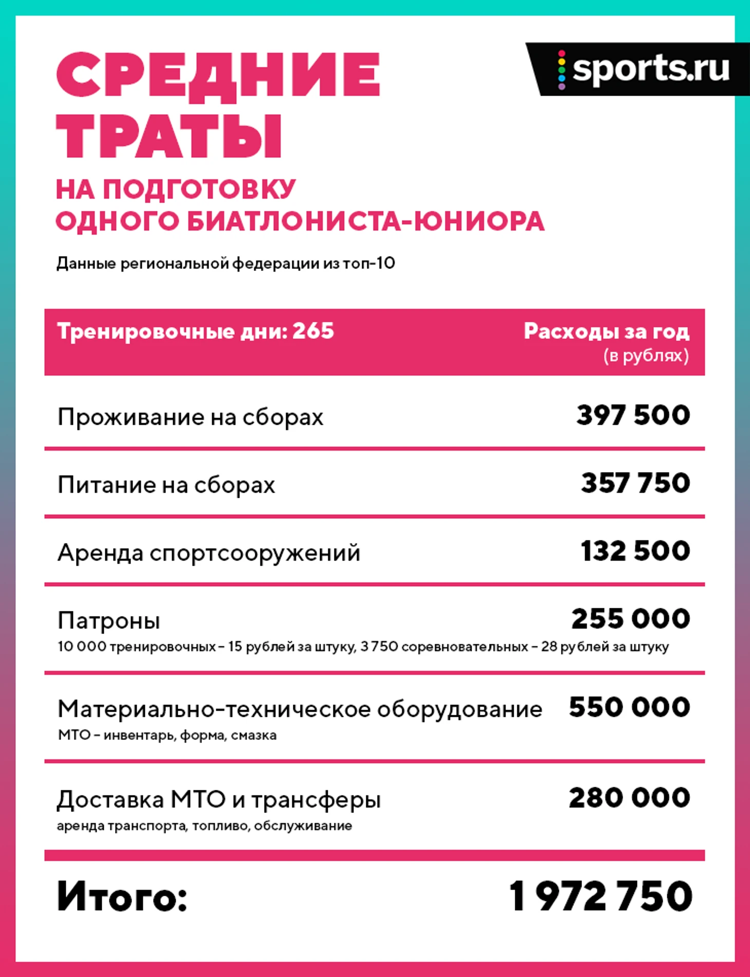 В распоряжении Sports.ru есть годовая раскладка на одного биатлониста возраста старших юношей или юниоров (18-19 лет). Это цифры от одной крепкой, но не самой мощной региональной федерации – не Тюмени и не Ханты-Мансийска.