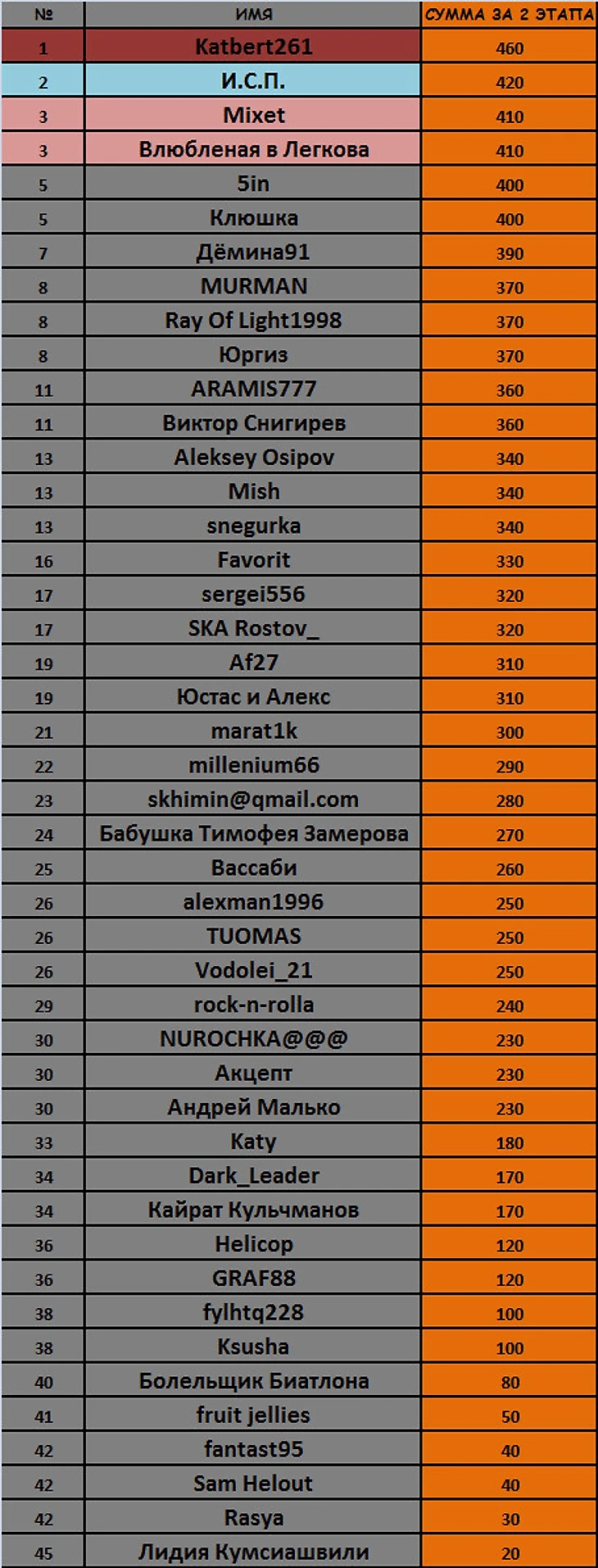 Добрый вечер, уважаемые любители прогнозов. Вот и подошел к концу уже второй этап. для сборной России он, безусловно оказался, удачным: на нашем счету две бронзы и два серебра. осталось дождаться победы.