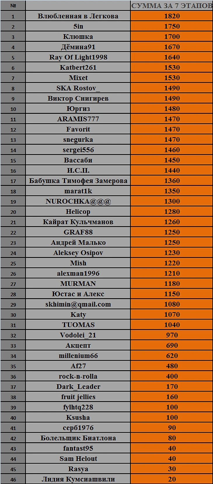 Ну и обратимся к общему зачету. Удачное выступление на ЧМ позволило пользователю 5in выйти на втрое место в общем зачете. А лидерство в нем удерживает как вы думаете кто? .... Я, что удивительно для меня самой .Ну ничего, поборемся