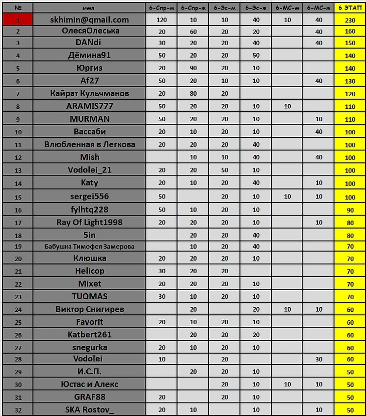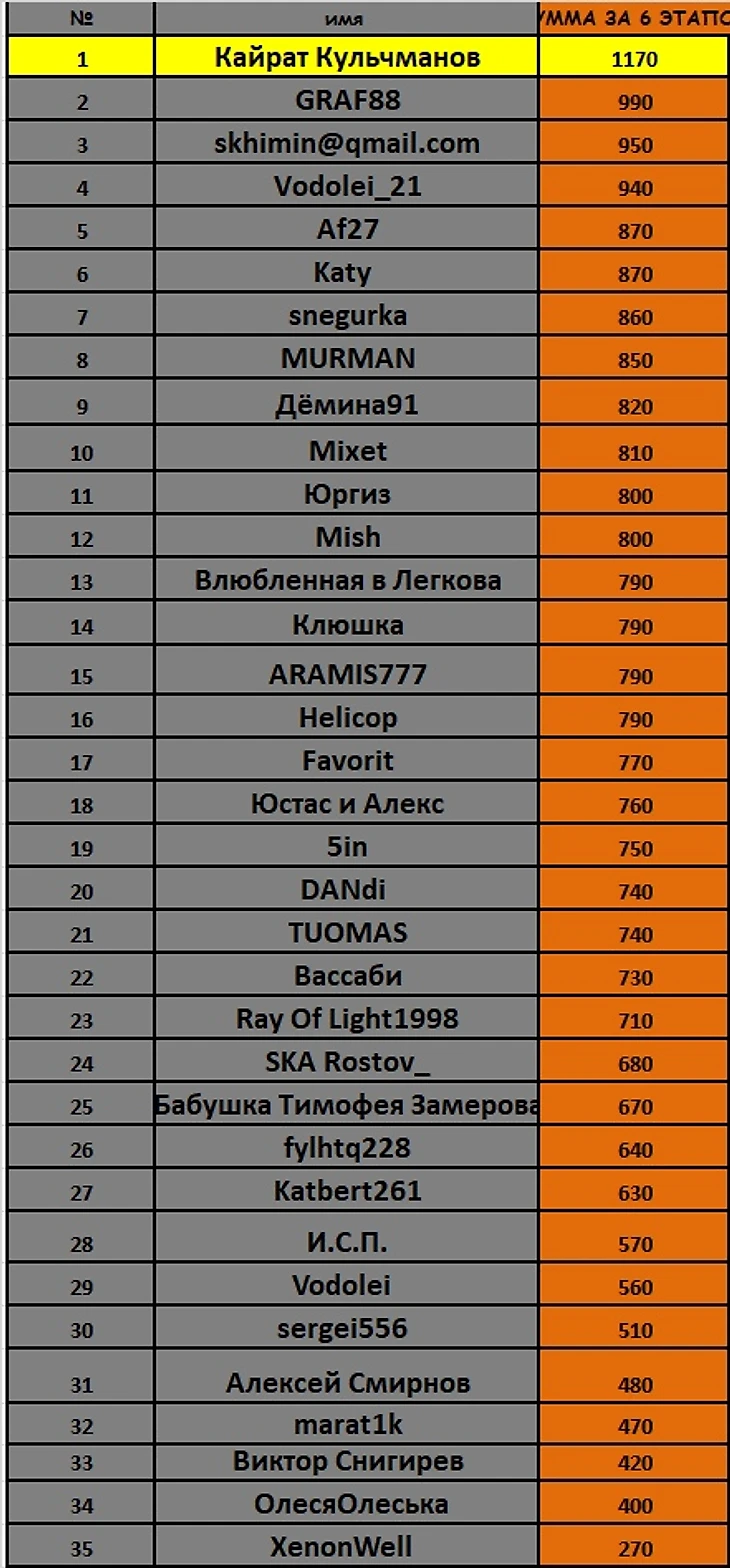 Теперь после 6-го этапа. Масс-старты были не самыми результативными. Победу на 6-м этапе одержал skhimin.