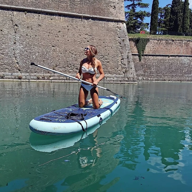 В прошлом году лето Доро провела активнее – открыла для себя сап. Выбрала для сплава белый балконет без бретелек.