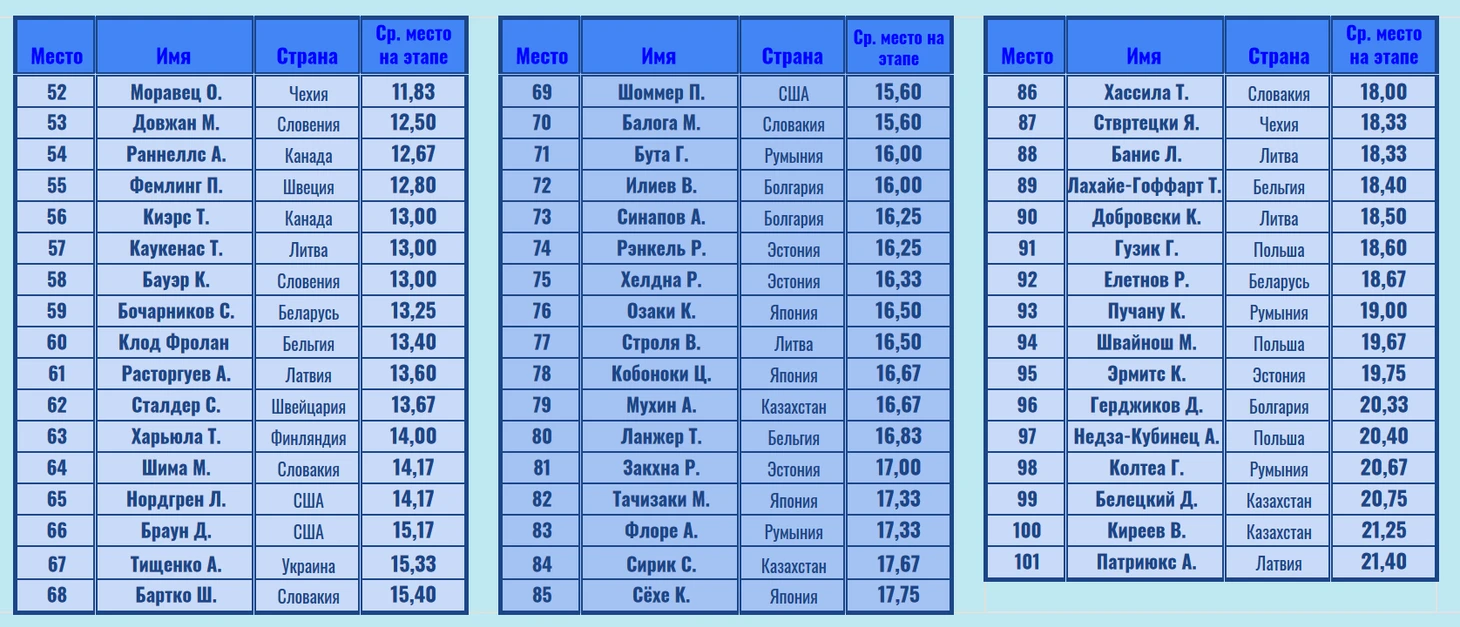 Ниже представлена формула нахождения среднего места по чистому времени на этапе за сезон, можете ознакомиться.