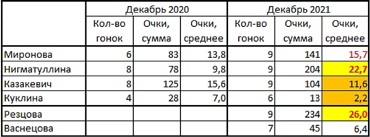 Сначала о разных кубковых зачётах. Начну с разбора набранных очков в ОЗ КМ. Лучшая здесь Кристина Резцова, расположившаяся на 9-м месте. Показатели Кристины и Леры сравнить с прошлым годом нельзя, а вот по остальной четвёрке сравним. Прибавили двое, двое же снизили этот показатель. Конечно, впечатляет рывок Ульяны: более, чем в два раза увеличила среднее количество очков за гонку. Как итог - 13 место в ОЗ КН и попадание в первый МС сезона. Немножко увеличила среднее количество очков за гонку и Светлана. Немножко неожиданным это для кого-то может показаться. Мы ведь "все знаем", что Света в этом сезоне "не бежит". Она у нас почти всегда связана с разными претензиями: то "научите Свету стрелять", то теперь вот "что Шашилов сделал с Мироновой?". А она по факту чуток лучше, чем год назад. Как итог - 25 место и тоже попадание в МС. Напомню, что год назад в первый МС попала одна Ира Казакевич. У неё по среднему видим заметный спад. Так ли всё плохо с Ирой? Нет. Напомню, в первых трёх гонках Ира не набрала очков. Зато в оставшихся набирала в среднем чуть больше предыдущего декабря. По ходу обновила лучший результат - теперь это 9-е место (ГП, Хохфильцен). Очень хорошо, что Ира достаточно быстро выбралась из ямы, которую я определяю психологической. А вот результаты Ларисы удручают. На КМ стабильная положительная динамика не просматривалась. Посмотрим, что будет дальше.