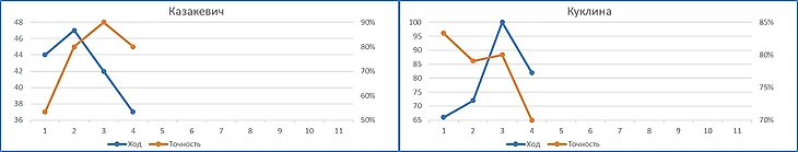 Следующий пул графиков - динамика хода и точности. Здесь у Мироновой после скоростного провала в Хохфильцене (второй декабрь подряд) наблюдаем лучшую картину на 4-м этапе. Ульяна, похоже, тоже на 4-м этапе нащупала форму: лучший ход и как-то восстановленная стрельба. А вот Лера на 4-м этапе явно сильно рисковала. Я бы даже употребил слова "пошла ва-банк": самая быстрая стрельба и почти лучшая скорость хода. Точность пострадала заметно при этом. Она пока что может так рисковать. Лично мне такой риск в её исполнении симпатичен. Как и спортивная дерзость Кристины. Графики Резцовой расположены как раз под графиками Ульяны. Направление линий как под копирку. И снова видим лучший баланс хода и точности на 4-м этапе. Казакевич после провала на первом этапе дальше только улучшала баланс. Лишние промахи в МС подпортили картину. Но нюанс в том, что подпортила она 90% точности, опустив их до 80%. Куклина после 1-го этапа в целом ухудшала баланс хода и точности.