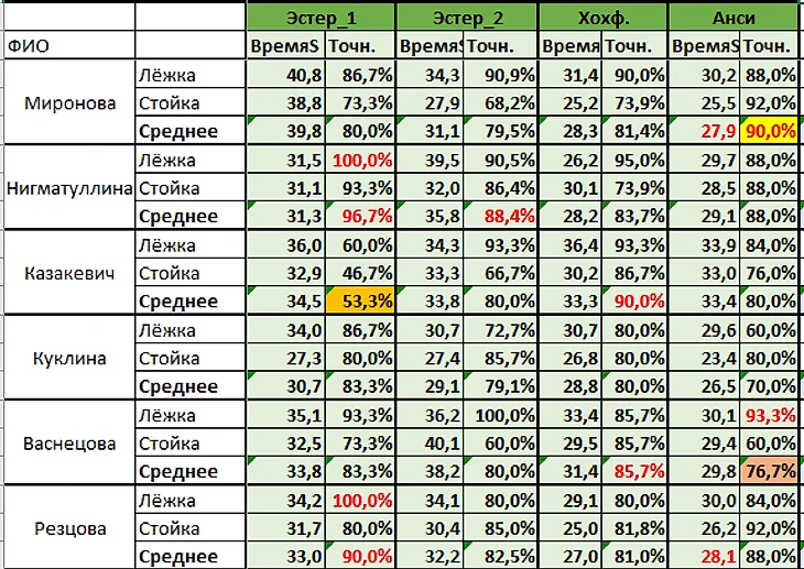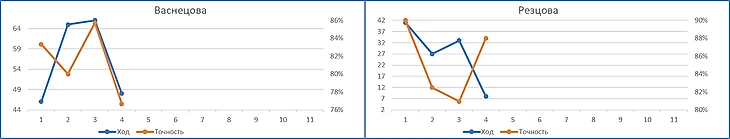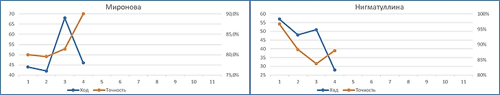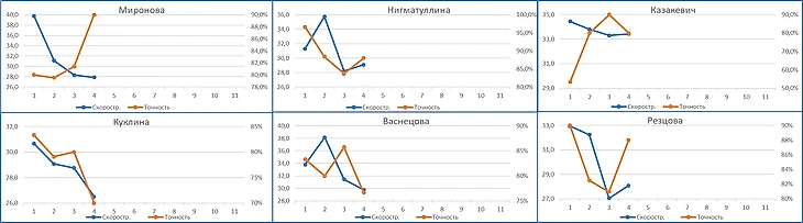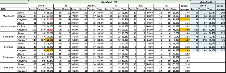 Посмотрим теперь на динамику точности и скорострельности в декабре. У Мироновой просто восхитительные графики: одновременное повышение скорострельности и точности. У Ульяны лучший баланс стрельбы был на 1-м этапе. Затем с падением точности видим скачки в скорострельности. Казакевич уже на втором этапе нашла некий свой баланс. Который в МС нарушила лишними промахами. Лариса стрельбу постоянно ускоряла, но при этом падала точность. У Васнецовой лучший баланс был на третьем этапе. Кристина, если смотреть только на стрелковые графики, искала свою стрельбу в декабре. И на 4-м этапе показала лучший баланс.