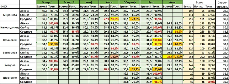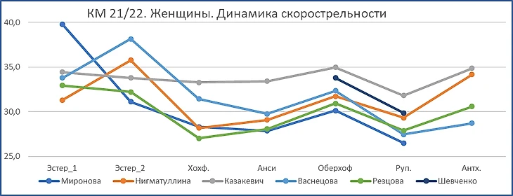 Динамика скорострельности. Здесь видно дружное замедление стрельбы. При этом у Васнецовой второй этап подряд скорострельность одна из лучших (в отсутствии Мироновой просто лучшая). Глядя, сколько тратила Лера на стрельбу в начале сезона, диву даёшься такому прогрессу в течении сезона.