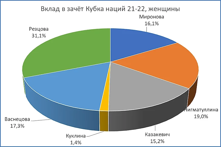 Вклад в зачёт Кубка Наций. Пропуск ИГ Кристиной и Светой снизил немного их проценты. Но в целом картина почти не поменялась. Кристина остаётся явным лидером.