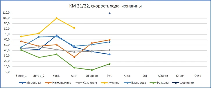 Но пора переходить к цифрам. В графиках скорости нового ничего не прибавилось, потому как спринтерской гонки в Антхольце снова не было. На всякий случай просто привожу график с предыдущего обзора. Про нюансы скорости хода в отдельных гонках несколько слов напишу ниже, где будут упоминания об этих гонках.