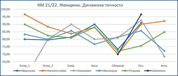 Динамика точности. Кристина и Ульяна возвращают точность. У Леры и Иры падение. Для меня вполне объяснимое: это Антхольц, к тому же сошлись сложные условия и какой-то недостаток в базовой работе, недостаток опыта. Дальше с каждым разом должно быть лучше.