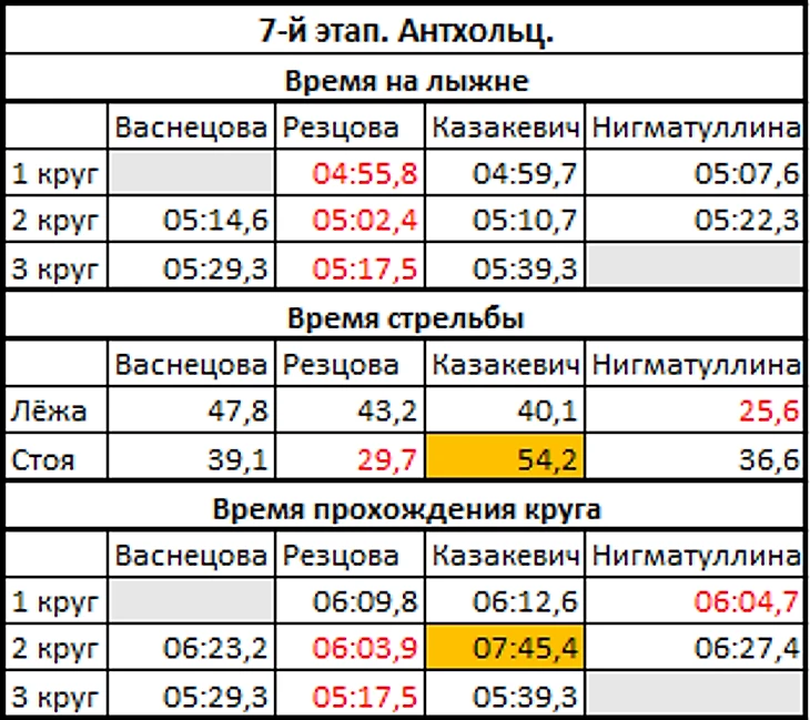 Эстафета. Цитировать себя - не очень-то хорошо, но вот что написал в обзоре Рупольдинга: "девушки, если уж в сезоне должен быть штрафкруг, сделайте его, пожалуйста, в Антхольце. Не откладывайте на Пекин". Спасибо, сделали. Ира вот перевыполнила. Более чем достаточно. В Пекине теперь спокойно, без боязни, без груза обойтись без этого. Высказывал опасения по Ульяне. Третьим кругом в эстафете несколько успокоила (после ИГ было непонятно). Ира два круга держала скорость. На третий пока не хватило (держим в уме лишние 450 метров). Есть осторожный оптимизм. Если смотреть на относительную скорость, то, похоже, Ира и вправду слишком быстро пошла на втором круге. Слишком быстро, чтобы на рубеже спокойно отработать. Что ж, опыт сам по себе не приходит. В том числе опыт лидирования в контактной гонке. К этому тоже надо привыкать, нарабатывать. Цифры Леры по времени на лыжне смотрятся приемлемо (учитывая, что перед этим неплохо прошла ИГ). Отдохнувшая Кристина ходом, похоже, на каждом круге была быстрейшей у нас. Хоть местами и на чуть-чуть, но лучше. Красные цифры в её колонке красноречиво :) на это указывают. В эстафете Рупольдинга картина отличалась (там Лера и Света показывали лучший ход, чем Кристина). Это подтверждает тезис, что Кристина "наелась" по сезону. Может быть, больше психологически, чем физически. И даже пропуск одной длинной гонки пошёл на пользу. Скорострельность в эстафете у команды в целом на сей раз ниже предыдущих. Вполне вероятно, что чего-то похожего стоит ждать на Олимпиаде. Где также высота и ветер.
