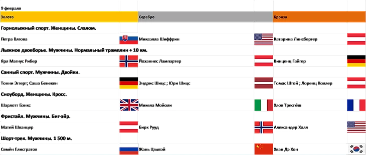 После тяжёлого и насыщенного событиями пятого дня, отдохнём в размеренном и спокойном шестом. 9 Февраля нас ждут интересные виды олимпийской программы, но нет той напряжённости, нет того национального и межнационального интереса к спортивным событиям дня. Как будто разрозненные виды, не связанные нашей любовью к спорту, одни маленькие группки будут смотреть одно, другие другое, это не плохо, просто констатация факта.