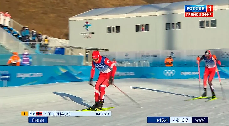 Йохауг первая, Непряева отстает на 14 секунд. Теперь 7,5 километров коньком впереди.