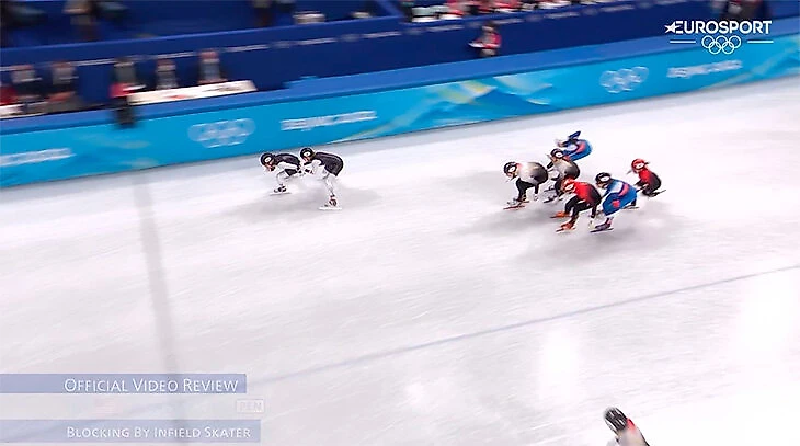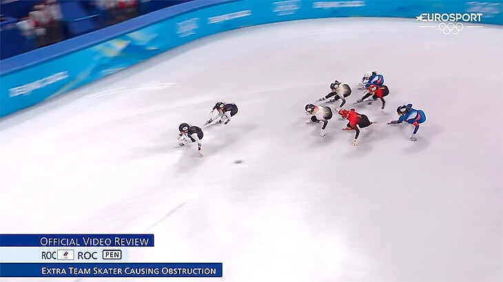 А тут он прямо между двумя китайцами, которым нужно передавать эстафету – и мешает им. На самом деле именно наши и виноваты, за такую блокировку и удаление. А раз удаление – это даже без шансов пробежать в финале B (с ма-аленькой, но надеждой на медаль – ее бы можно было зацепить, если бы и в финале вот так дисквалифицировали 2 из 4 команд).