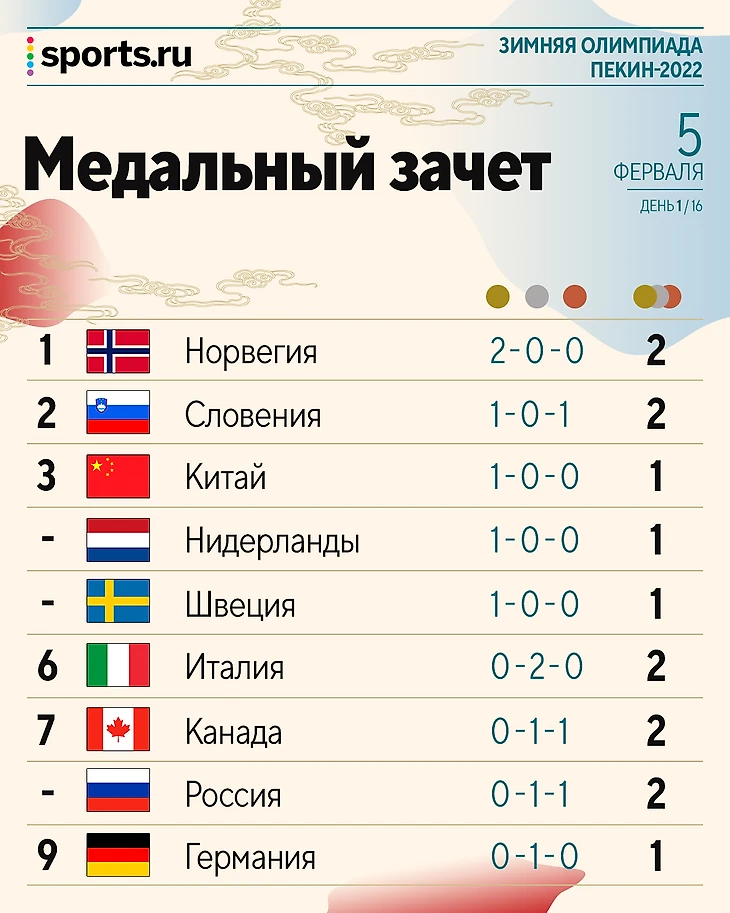 Норвегия сразу лидирует – за счет лыж и биатлона, Китай выхватил первое золото как раз в ярком шорт-треке. Наши без золота, поэтому в нижней половине списка тех, кто уже взял награды