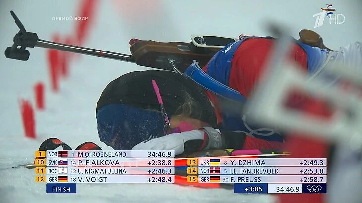 Едва пересекла финиш, Тандревольд рухнула. К ней тут же подбежали другие биатлонистки и отцепили лыжи. Ингрид все не вставала – лежала, уткнувшись лицом в снег.