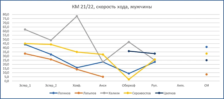 Скорость в спринте получилась не очень. Латыпов по ходу форму набирал, а вот Логинов какой-то рваный график демонстрировал. По факту оказался самым медленным в команде. При том, что в эстафетных гонках до и после спринта показывал вполне хороший ход. Опасения по Латыпову оказались напрасны - ногами на Олимпиаде был в целом хорош. У Серохвостова пика не случилось, в январе он был быстрее. Цветков же бежал быстрее, чем в январе, но этого не хватило для медали в СП с чистой стрельбой. Проиграл бронзу Максим старшему Бё не только на лыжне, но и на стрельбище (Тарьей потратил на стрельбу на 9 секунд меньше).