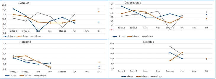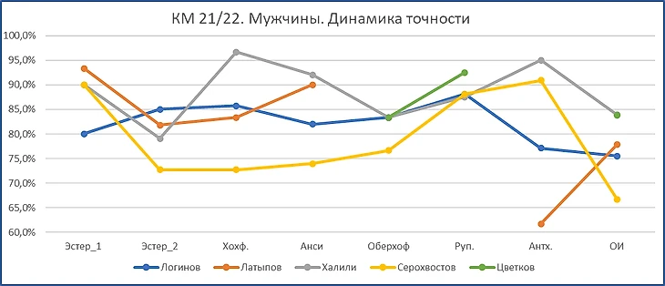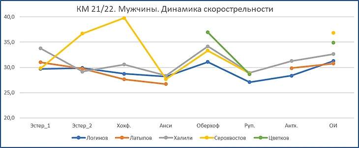 Условия стрельбы отразились на двух следующих графиках. График Латыпова - исключение, из-за стрелкового провала Антхольца, где он провёл первые гонки после карантина.