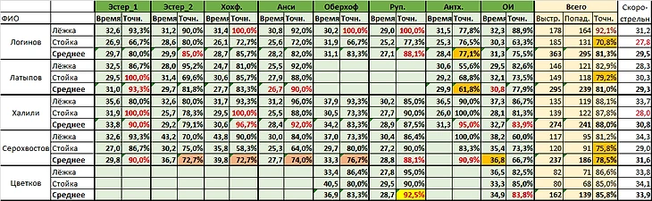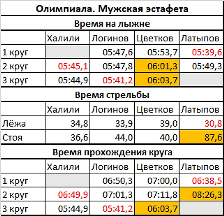 Стрельба. Так же, как и у девушек, не стал выделять оранжевым плохую точность. Красным отметил хорошую точность Карима и Максима. Но Макс провёл почти все гонки, поэтому именно он у нас лучший стрелок Олимпиады. При этом, как помним, остался в двух гонках четвёртым. Можно сказать, что не повезло. Но полезнее, на мой взгляд, сказать, что недоработал. Латыпов стрелял быстрее всех, Серохвостов - наоборот. В лотерейных условиях и выцеливание, и "пулемёт" вполне были применимы: есть порыв - выцеливаешь, нет - включай режим пулемёта. Критиковать за стрельбу тоже никого не буду.