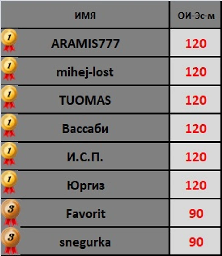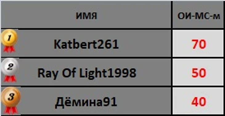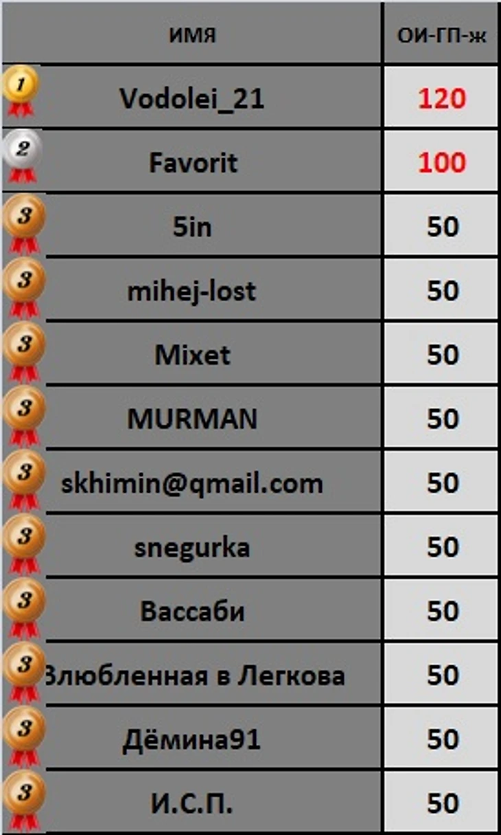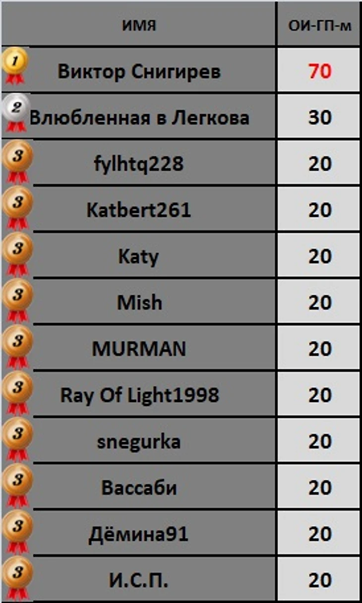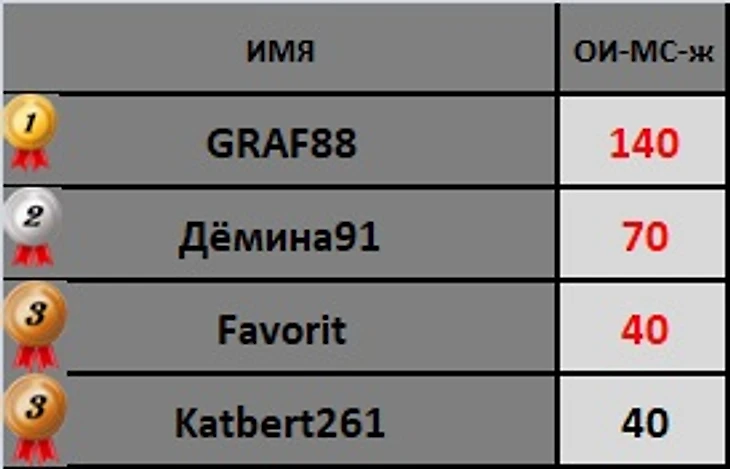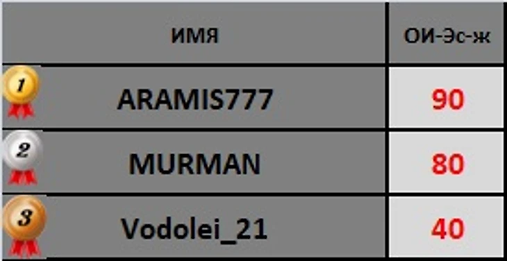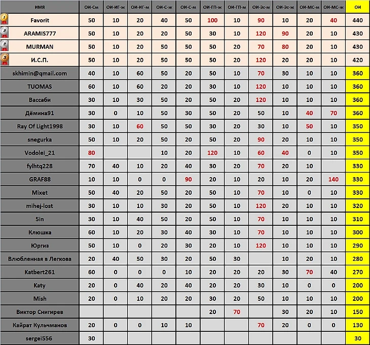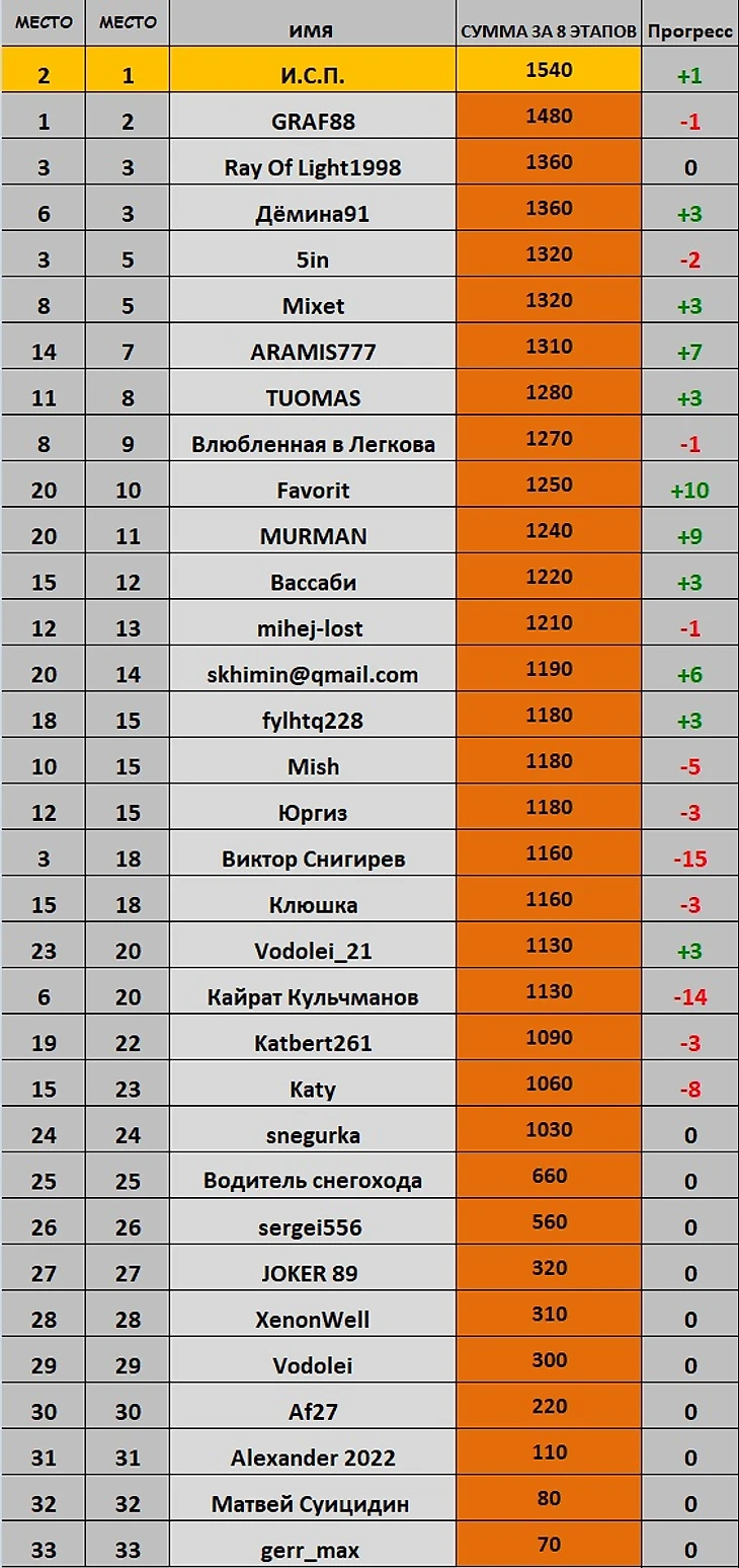 За счёт бронзы игр И.С.П. вырывается в лидеры, а Favorit, MURMAN и ARAMIS777 существенно улучшили своё положение в рейтинге.