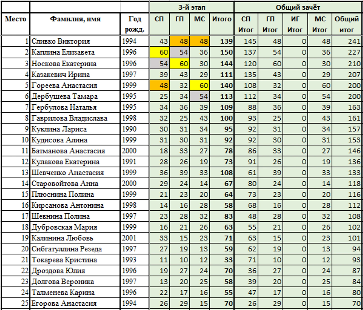 Список включённых мною для обзоров пока не меняю. Возможно, сделаю это после 4-го этапа. Теоретически, напрашивается замена Полины Плюсниной на Владу Гаврилову. Возможно, просто добавлю Владу. Это зависит от того, как они обе выступят в Уфе. Раздувать таблицу не хочется.