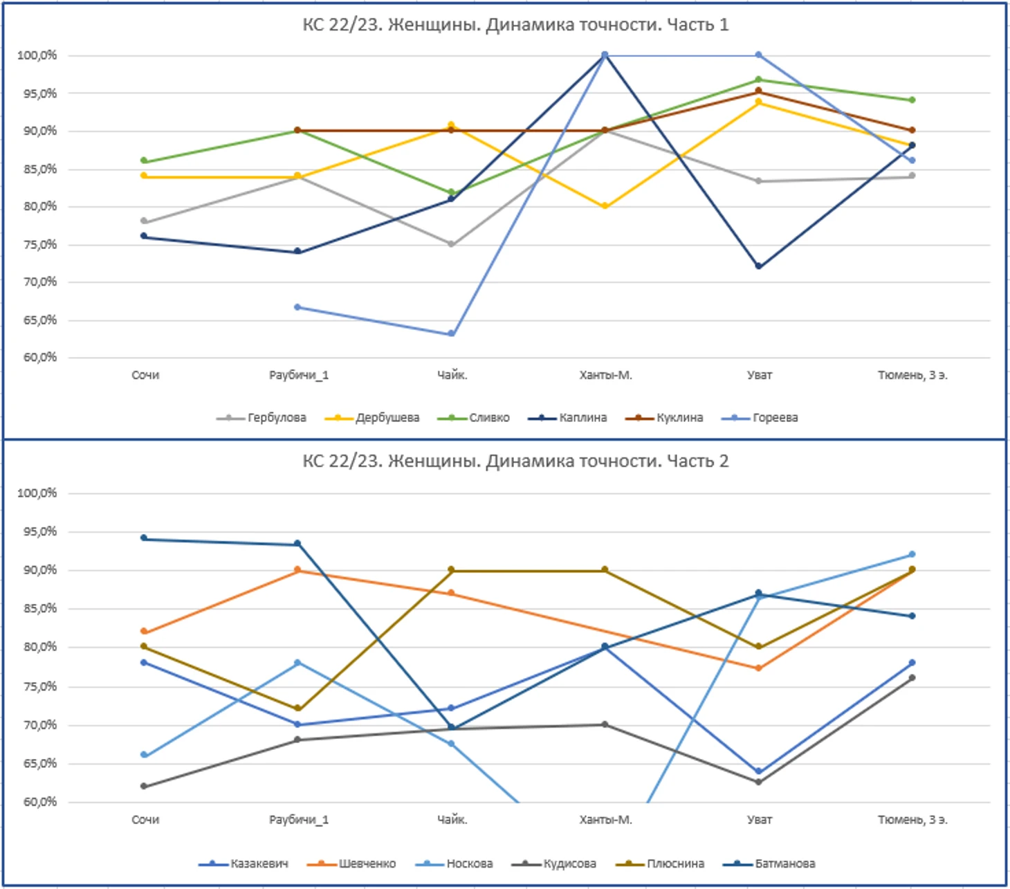 Точность стрельбы в динамике. Попытался сгруппировать девушек так, чтобы графики были хоть как-то читаемыми. Учитывая, что на двух этапах у девчат было по одной короткой гонке, что-то «глубокое» выявлять рано. Потому как перепады объясняются в том числе и тем, что на было по одному спринту на этапах. Будем смотреть, кто куда стрелять будет дальше. Изменения будут. В том числе из-за динамики формы.