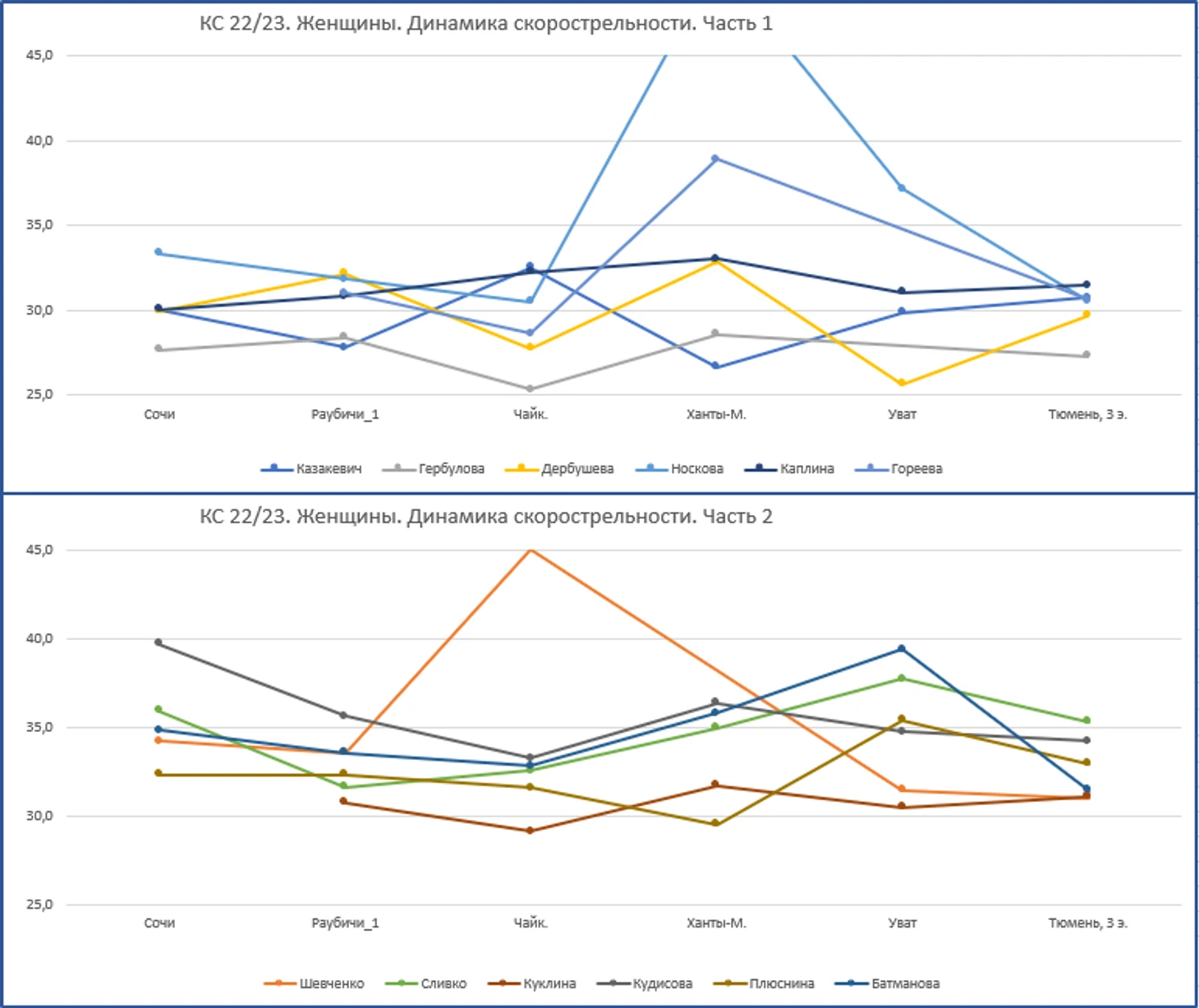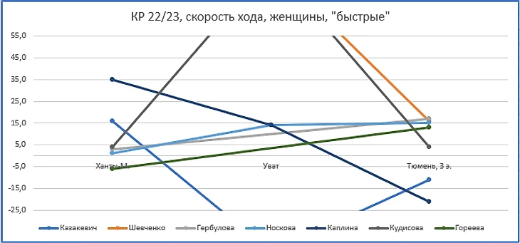 А теперь обещанные несколько слов про скорость Иры Казакевич. Отрывы почти в 50 секунд на пустом месте не рождаются. За ними что-то есть. При этом на графике видим, что другие наши скоростницы в Увате не провалились относительной скоростью (не относительно Иры, конечно, и за исключением какой-то катастрофы у Алины). После этого явное замедление у Иры в Тюмени. Хоть и второй ход, но всё же. Но из головы не выходят слова Михаила Викторовича о «нескольких» в той или иной степени приболевших. «Несколько» и по факту одна не стартовавшая Наташа Шевченко. Так одна или несколько? Суммируя это всё, подозреваю, что Ира была в числе этих «нескольких». «Кто-то», по словам Шашилова. Он ведь никого не назвал. Подозреваю, что история Увата в меньших, конечно, масштабах, может получить продолжение. Первую проверку мои подозрения пройдут уже скоро, в Уфе, на 4-м этапе КР.