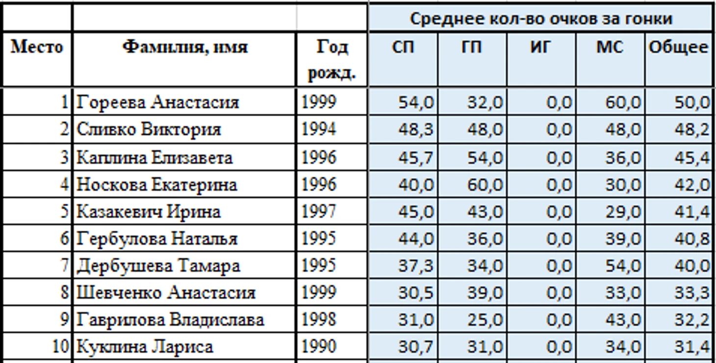 А вот как выглядит первая десятка ОЗ КР по среднему количеству очков за гонку. После МС Настя Гореева обошла Вику Сливко. Шевченко по этому показателю восьмая. Так что я жду её в топ-10. За Горееву очень рад!