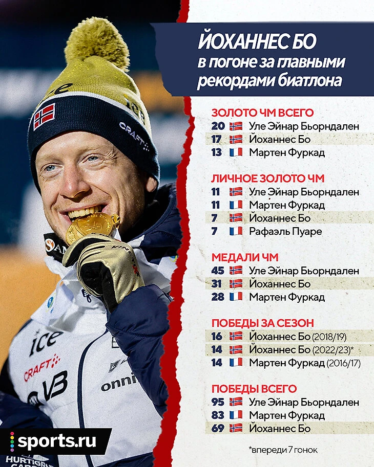 По числу побед за один сезон Бо пока уступает самому себе – 14 в этом году против рекордных 16 в сезоне-2018/19. Но впереди еще 7 личных гонок на Кубке мира – достаточно, чтобы обновить рекорд.