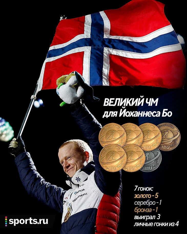 Вообще, карьера Йоханнеса на чемпионатах мира уникальна – он выступал на семи турнирах и на всех завоевывал медали, на 6 из них – хотя бы одну золотую. Только на ЧМ-2017 в Хохфильцене норвежец не выиграл ни разу, зато взял три серебряные медали.