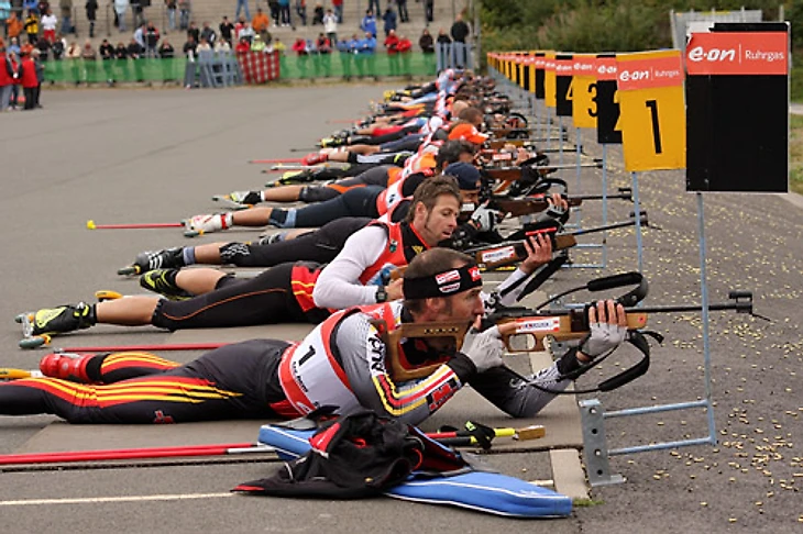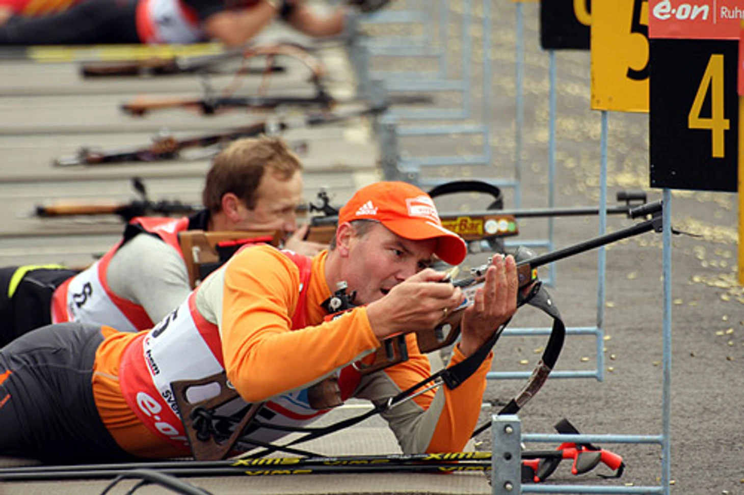 Под овации болельщиков биатлонисты отправляются на пристрелку. Винтовки ждут их на стрельбище � это своеобразная поблажка для ветеранов. Фишер и тут не оставляет своих организаторских функций � у Драчева что-то не клеится со стрельбой, и Свен привозит ему подзорную трубу. Рядом немедленно вырастают Люк, Гросс (на фото), Кирхнер, и все четверо начинают «тренерский совет» прямо на месте.