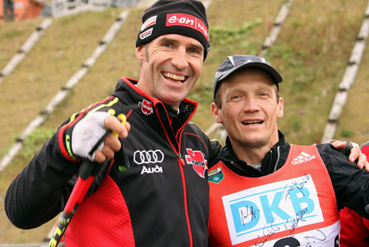 Пока же Sven Fischer Classics � больше междусобойчик, чем международная гонка. В Оберхофе отметилось большинство главных героев немецкого биатлона последних лет � Франк Ульрих (на фото � слева), Марк Кирхнер, Рикко Гросс, Франк Люк, Петер Зендель, Карстен Хейманн. К всеобщему удовольствию на старт вышел и сам герр Фишер. Среди иностранных гостей, помимо Драчева (на фото � справа), в Оберхоф приехали Людвиг Гредлер, Андреа Грасич-Коблар, Вилфрид Паллхубер и Натали Сантер-Бьорндален.