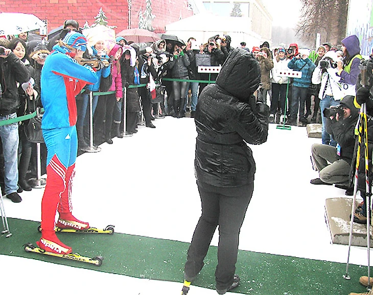 Капли утреннего дождя, кажется, никуда не падали, а просто мельтешили в воздухе. Антон Шипулин и Ольга Вилухина готовились к мини-забегу с болельщиками — авторами лучших стихов о «Гонке чемпионов» — как раз в сердцевине галдящей массы. Антон стоя на правой ноге (его болтало как в водовороте) пытался выводить автографы на всем, что видел. Опорой служило колено левой ноги. Попутно лидера нынешней сборной России просили попозировать для фото.