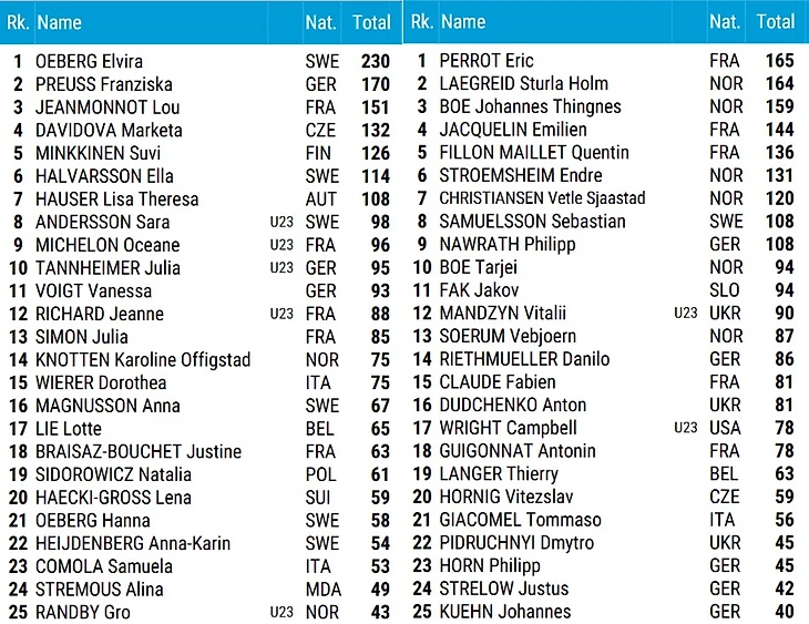 У мужчин общий зачет куда более плотный, а лидером является Эрик Перро. Но Стурла Холм Лагрейд всего в 1 балле позади, а Йоханнес Тиннес Бе – в пяти. Недалеко и Эмильен Жаклен, Кентен Фийон-Майе и Эндре Стремсхейм, которые могут после одной удачной гонки подняться на вершину тотала. Более сотни баллов набрали Ветле Шостад Кристиансен, Себастьян Самуэльссон и Филипп Наврат. А ветераны Тарьей Бе и Яков Фак находятся на границе между первой и второй десяткой, опережая лидера зачета до 23 лет Виталия Мандзына.