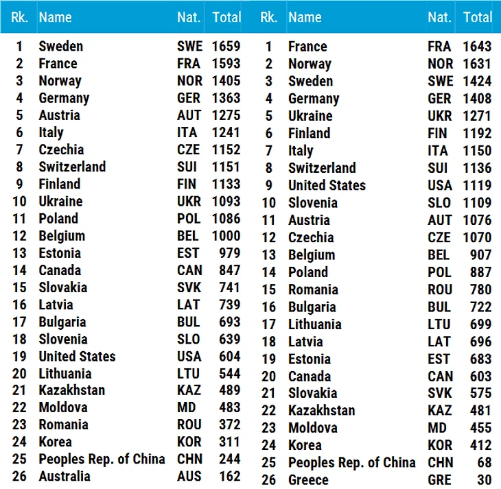 У мужчин же в лидерах Франция, но Норвегия близко, а Швеция борется за третью строчку, пока опережая Германию. Украина неожиданно занимает пятую строчку, опережая Финляндию, Италию, Швейцарию, США и Словению.