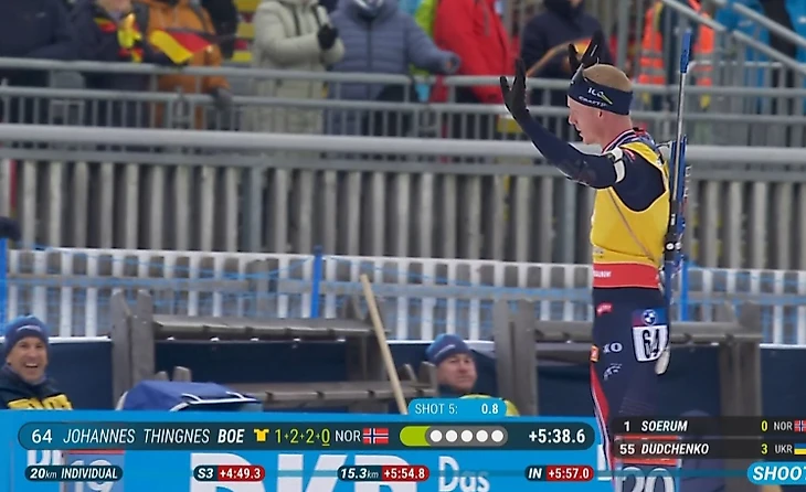 ● То, что с Йоханнесом происходит странное, было заметно еще на днях: он промахнулся пять раз на первых рубежах и бросил бежать. Буквально шел пешком, никуда не торопился и в отвязном режиме расстрелял мишени на последнем рубеже – затем поприветствовал зрителей и собрался сойти.