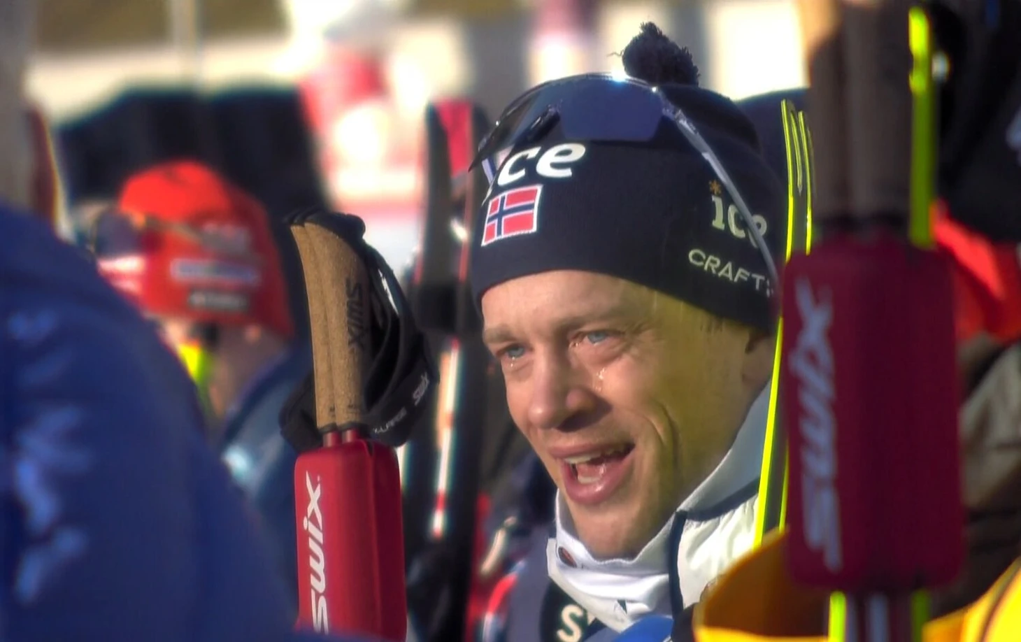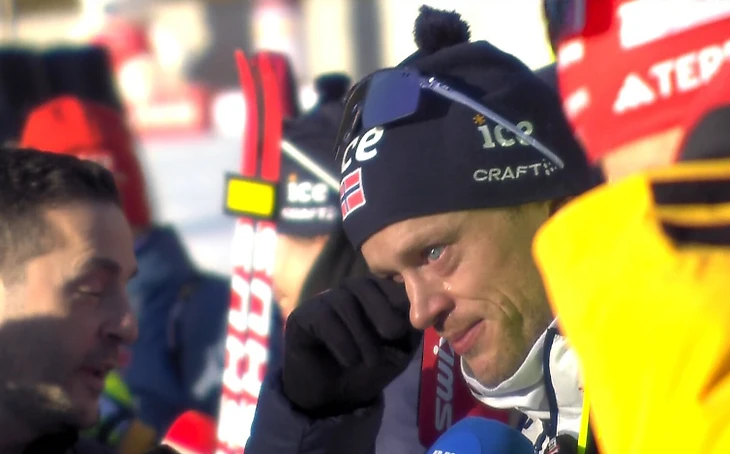 После гонки в кадр попало общение Тарьея с норвежской прессой. На глазах – слезы.