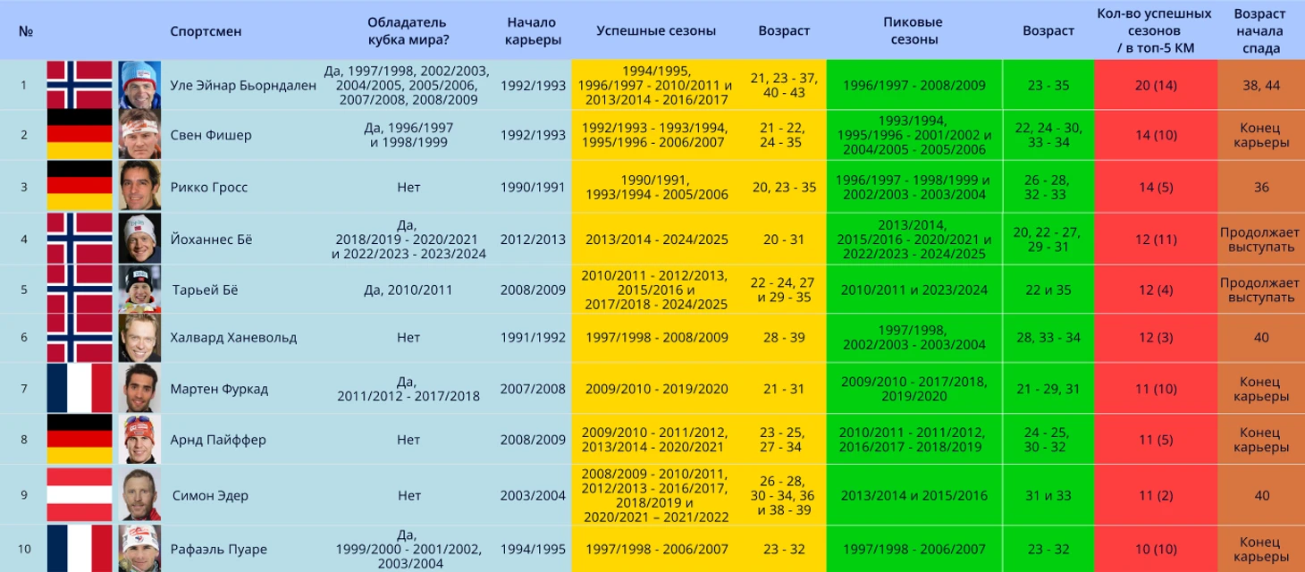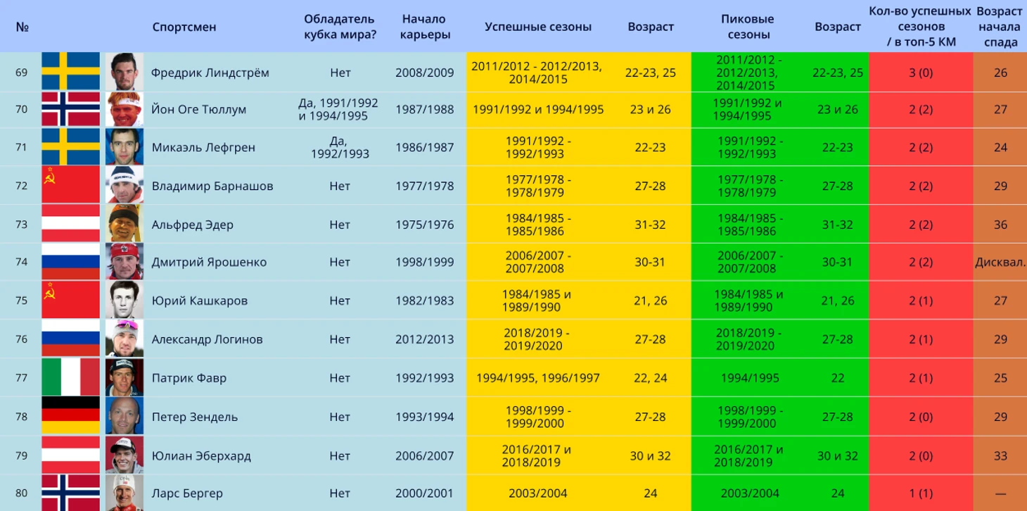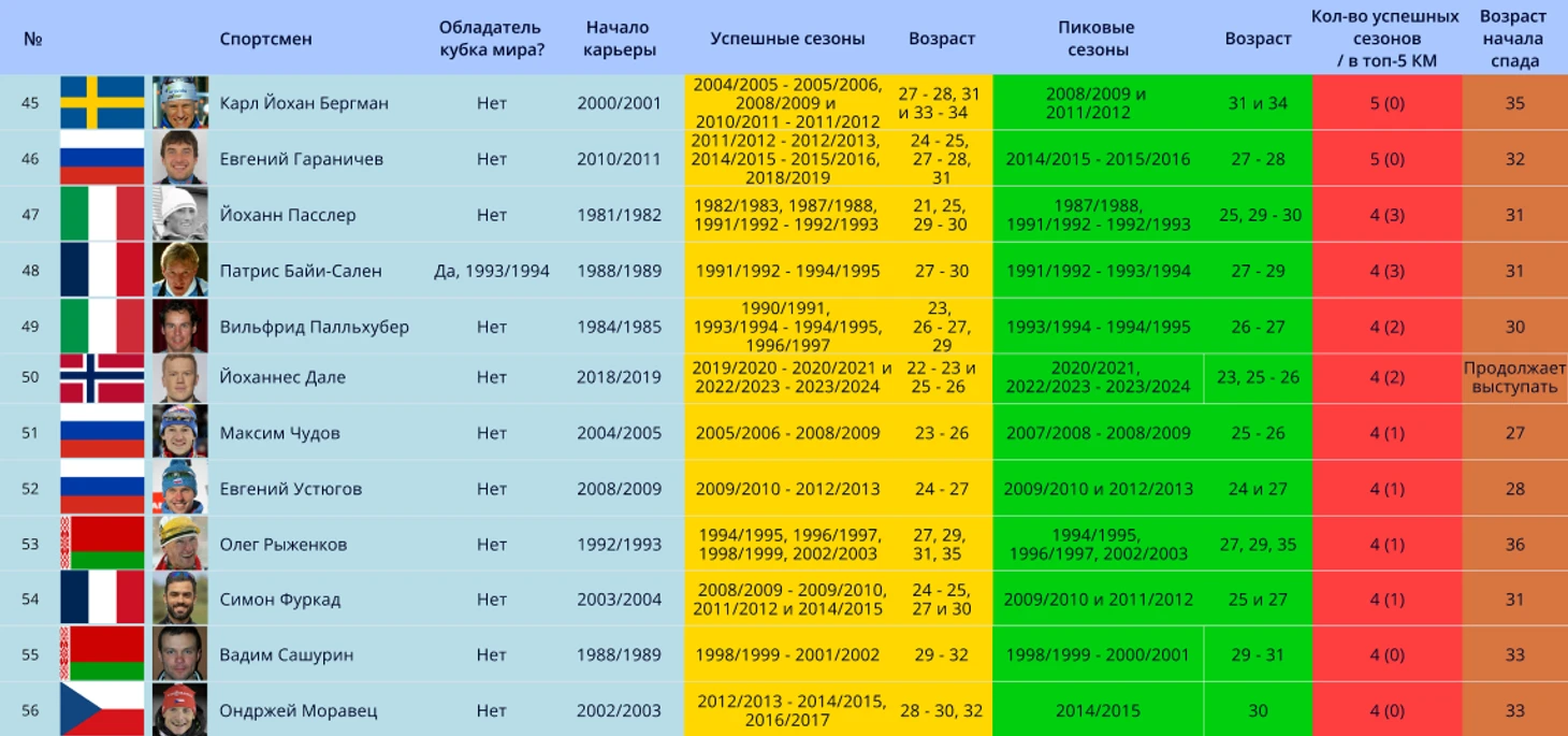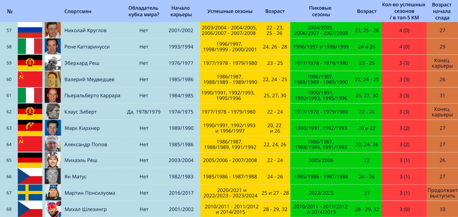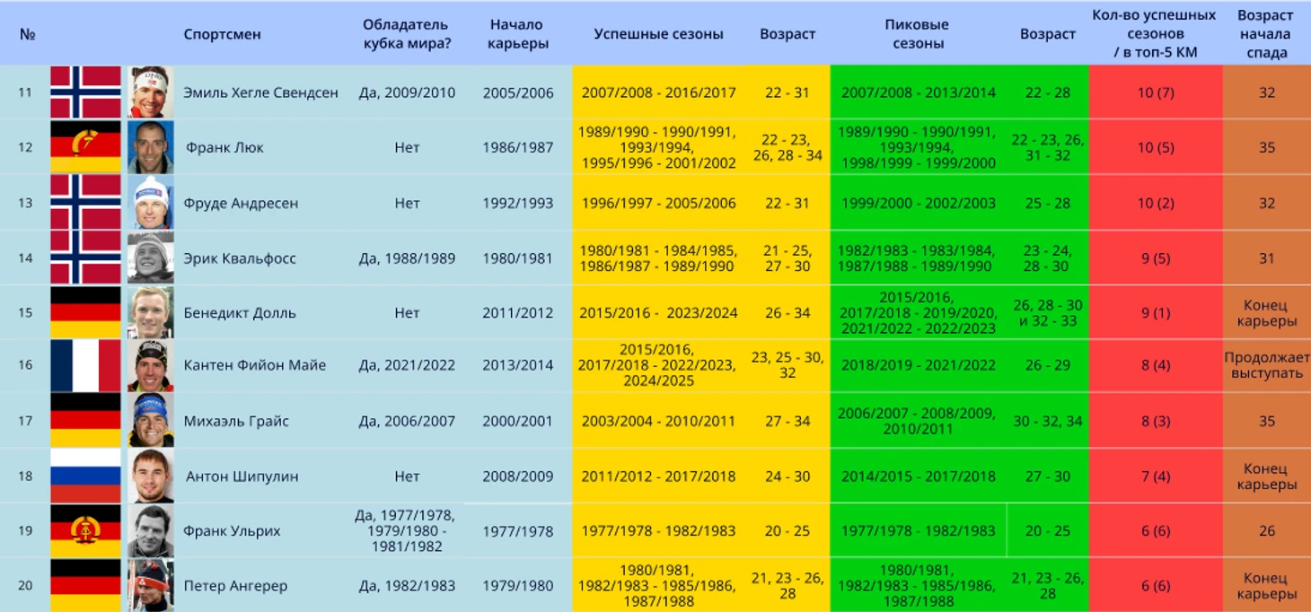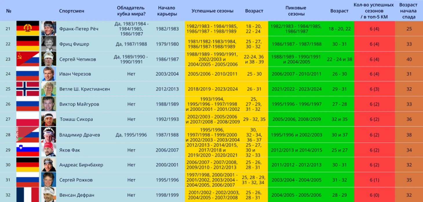 Примечание: прежде чем приступить к представлению биатлонистов, стоит пояснить, что в таблице означает графа в таблицах «успешные сезоны». Для данной статьи было решено включить попадание в топ-15 КМ за успешное окончание сезона, если выступления спортсмена проходили с сезона 1996/1997 и позже. Но если выступления спортсмены были до сезона 1996/1997, то для «успешности» требуется попадание в топ-8. Это было сделано для уравнивания показателей спортсменов из разных поколений. Все из-за того, что раньше в биатлоне было намного меньше гонок в сезоне (10 до сезона 1988/1989, 12 – до 1994/1995 и 14 до 1996/1997). и меньше участников-конкурентов.