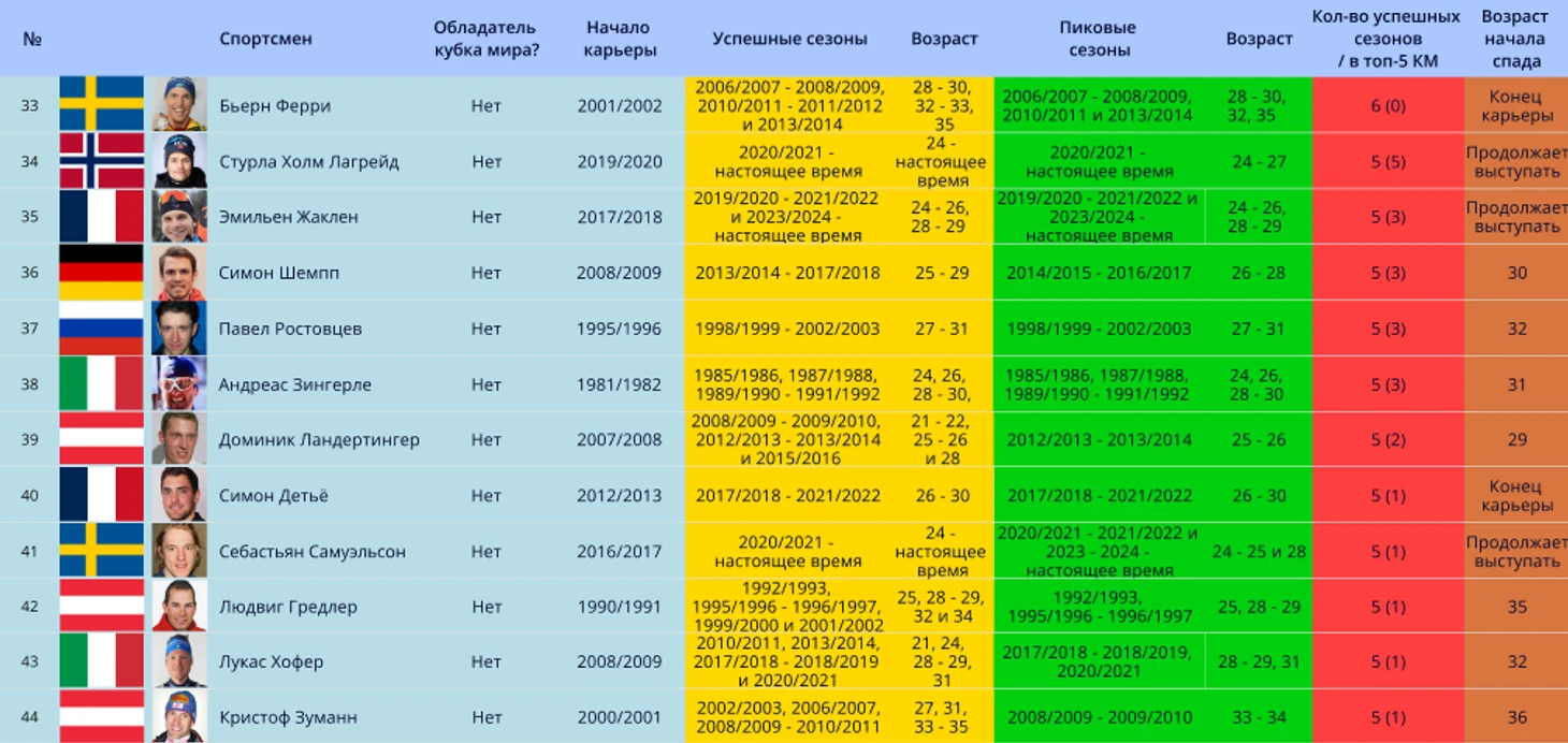 41) Себастьян Самуэльсон – олимпийский чемпион в эстафете (2018), серебряный призер Олимпийских игр 2018 года в гонке преследования, двукратный чемпион мира, многократный призер чемпионатов мира. Лучшие сезоны: 2020/2021 – 2024/2025 (6, 3, 14, 9, 5 в Кубке мира). Все еще выступает, очень вероятно, что кол-во успешных сезонов увеличится.