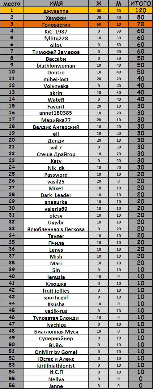 Ирину Старых смогли угадать только два участника - джузеппе и Головастик, они и расположились на 1-м и 3-м месте. А на 2-м у нас Хамфри, угадавший победителей обеих гонок+третье место Антона.