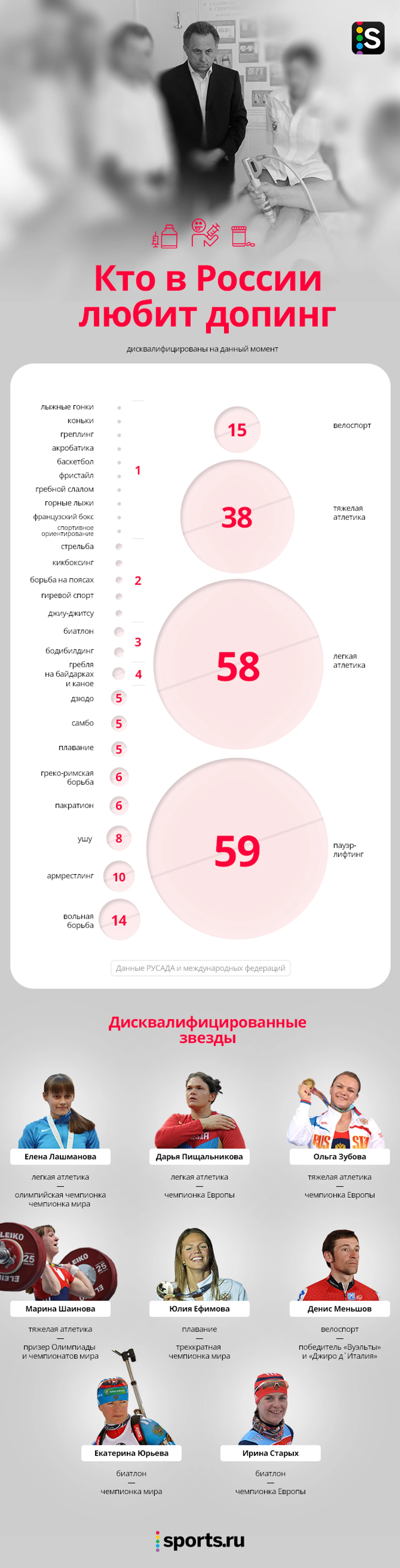 Мы не считали допинг-случаи за последние N лет, хотя такая статистика наверняка не понравилась бы министру спорта Виталию Мутко – учтены только те спортсмены, которые дисквалифицированы прямо сейчас по линии Российского антидопингового агентства (РУСАДА) и международных федераций. Эти данные незначительно отличаются: например, в списках РУСАДА нет звездных биатлонистов Екатерины Юрьевой и Ирины Старых и других спортсменов.