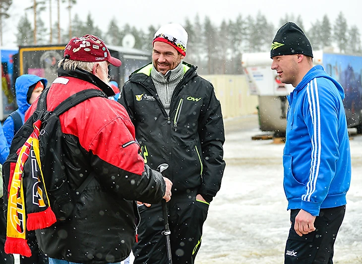 Норберт Штарке (слева) – немец, который на восьмом десятке не пропускает ни одной биатлонной гонки, в компании с соотечественником Михаэлем Решем (в центре), который сейчас выступает за Бельгию