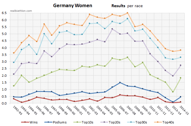 После сезона 2014-15 блог реалбиталон опубликовал график, где можно было отследить успехи/неудачи немецких девушек за 23 года биатлона. Выглядел он вот так: