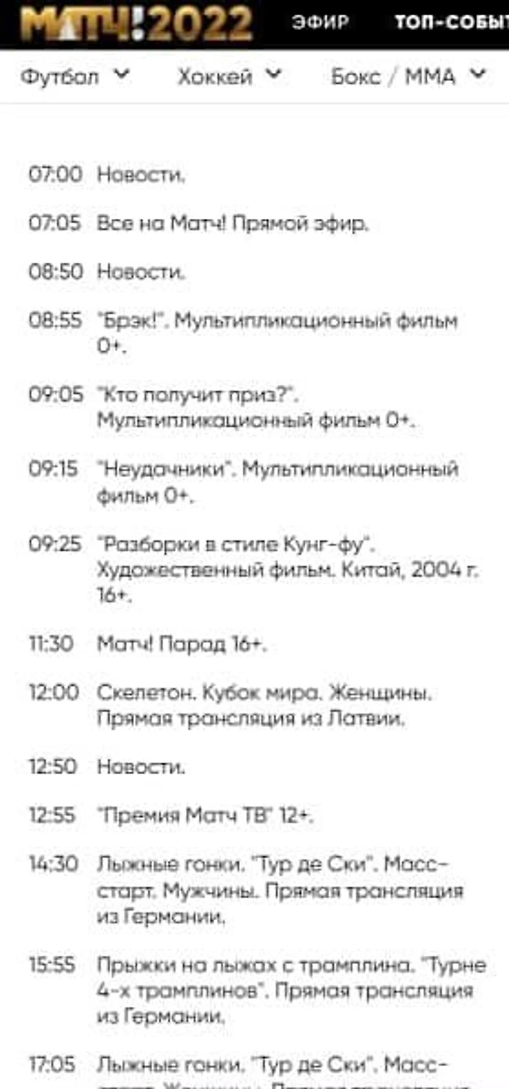 31 декабря к показу планировался этап Кубка мира по скелетону (прямая трансляция – с 12.00 по московскому времени). Сейчас в программе указан фильм «Полицейский с Рублевки. Новогодний беспредел» (с 10.20 до 12.20 по Москве) и фильм «Холоп» (с 12.20).