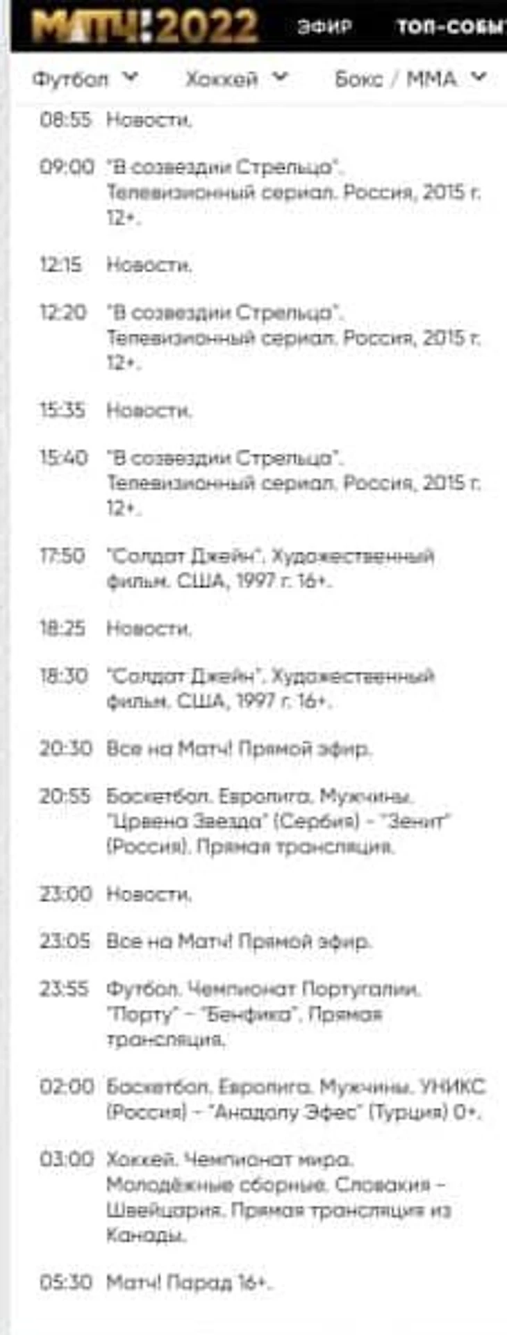 30 декабря в программе значилась трансляция матча баскетбольной Евролиги «Црвена Звезда» Сербия – «Зенит» Россия (начало – 21.00 по московскому времени).